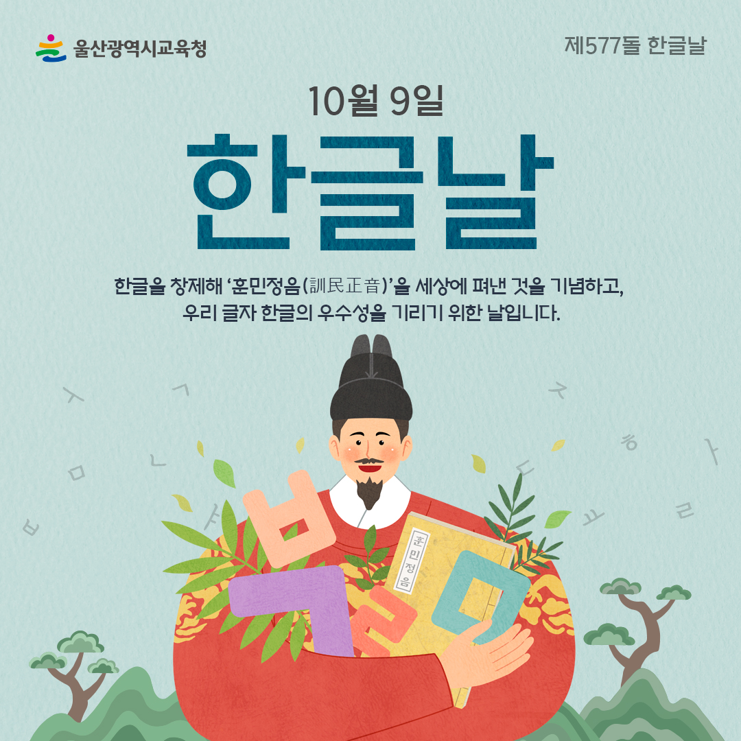 10월 9일은 자랑스러운 대한민국의 문자, 한글에 대해서 널리 알리고 그 창제와 반포를 기념하는 뜻 깊은 날입니다.